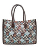 Crafted from durable patterned canvas, the bag features smooth leather handles that sit comfortably on the shoulder or in hand, adding a polished contrast to the textured body. Inside, the spacious open compartment easily fits a laptop, books, a scarf, camera, sunglasses, and small beauty items, making it ideal for commuters, students, travelers, and creators on the go.